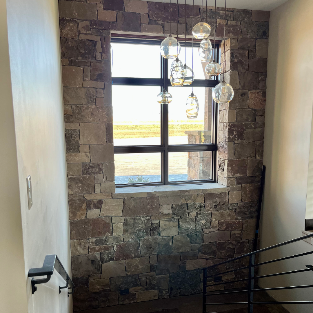 Material: Natural building stone ( Bar- Z ) in a square and rectangular pattern. This project had a perimeter wainscoting, stone caps, interior fireplace, interior accent wall with stone caps , and exterior custom tapered chimney.