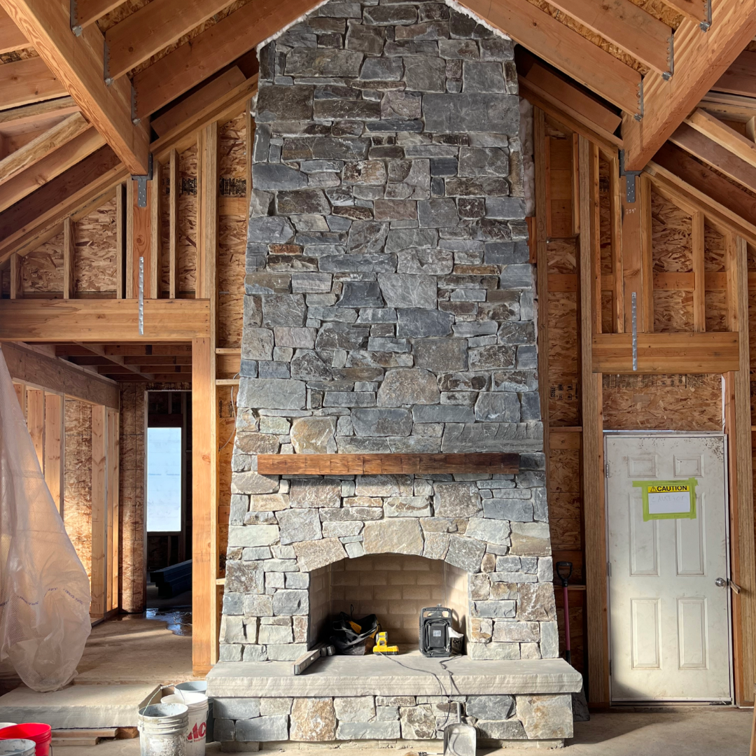 Material: Natural building stone (Montana moss) in a dry stack pattern. This project had a perimeter wainscoting, stone caps, interior fireplace, interior accent wall, exterior chimney, and sitting walls.